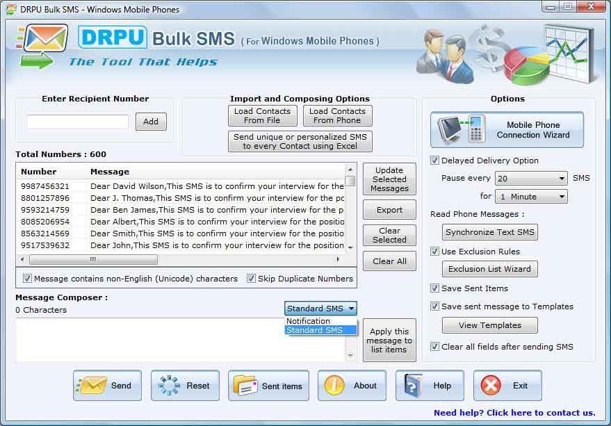 - Windows mobile messaging program provides advanced feature that allows you to send bulk text SMS in any text formats.