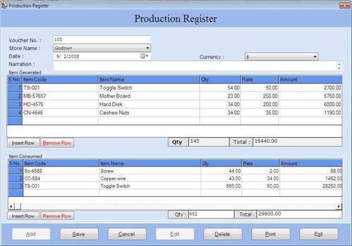 Production means creating or manufacturing of items or goods. Production Register Voucher is used to keeping the record of consumed raw materials and generated products while producing an item.